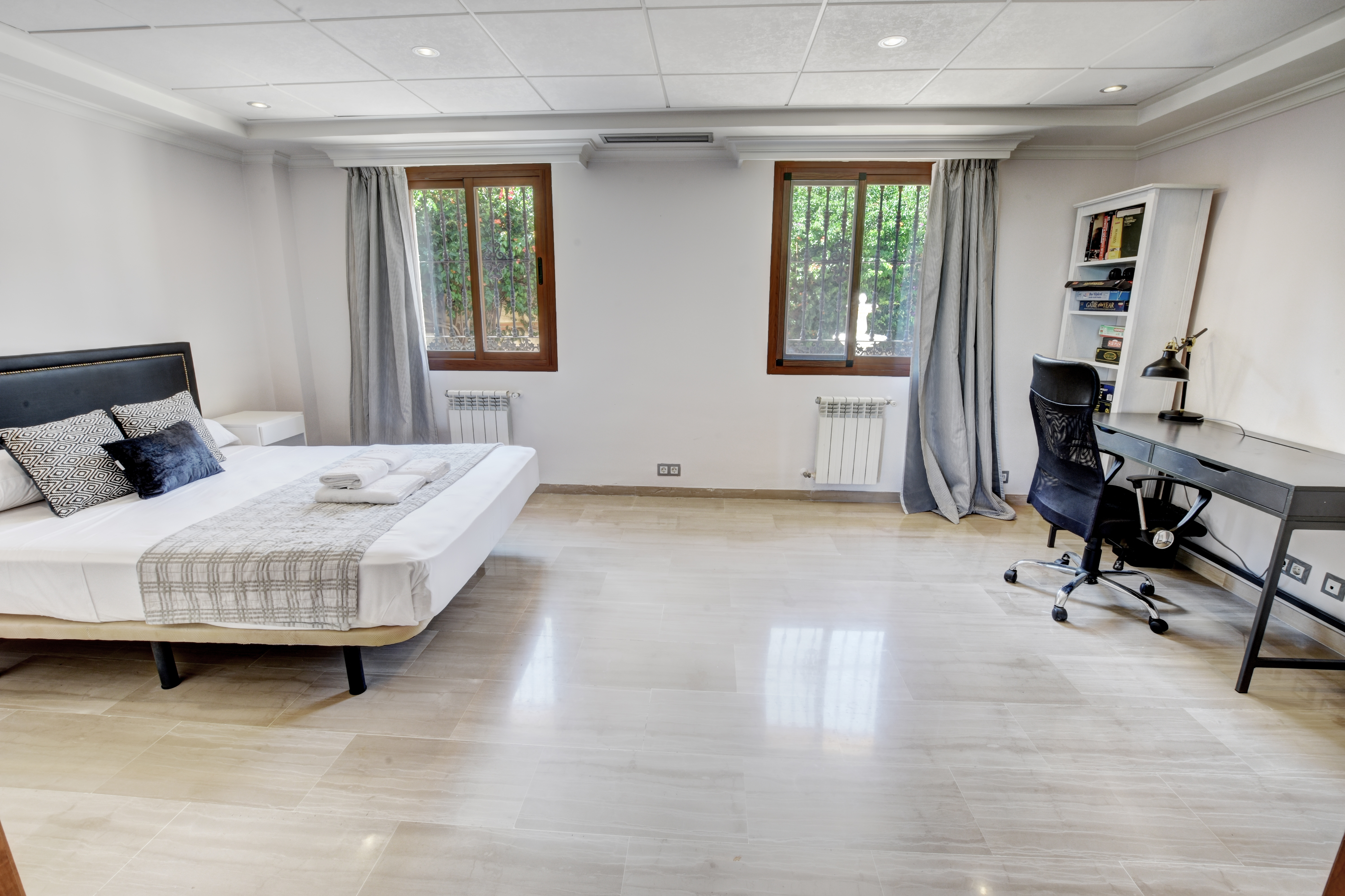 Construida en 2001, la villa ofrece seis dormitorios de generosas dimensiones, incluyendo un estudio independiente, ideal para invitados o alquiler vacacional. Actualmente cuenta con licencia turística en vigor, lo que la convierte en una excelente oportunidad de inversión.